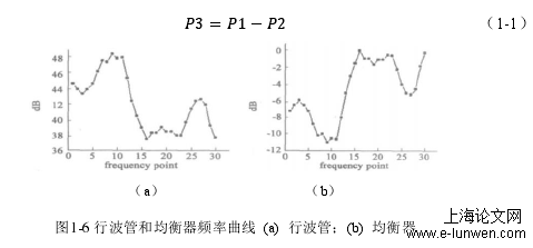 因为行波管这类电真空器件结构复杂,且受限于国内工艺条件,国内行波管的增益频率特性曲线在工作频带内通常是不平坦的,这种增益波动就导致每个工作频点的饱和输入功率和饱和输出功率都是不同的[6-8]。而整个系统中驱动行波管的前级固态功率器件提供的饱和输出功率却是平坦的,因此在输入激励相等的情况下,频带内各频点可能同时存在欠饱和、饱和及过饱和的工作状态,对于工作在连续波模式下的毫米波功率模块来说,通常希望行波管在等激励的条件下,每个工作频点的输出功率都能达到门限值并且在工作频带内的波动要足够小,所以若想得到等输出功率,各频点所要求的输入功率也是不相等的。因此为了使行波管工作在理想状态,需要对行波管的增益频率特性进行相应的均衡,从而使毫米波功率模块的输出功率稳定可靠。因为增益均衡器就是为了解决行波管带内增益不平坦导致的输出功率波动问题,因此增益均衡器也叫做功率均衡器。功率均衡器实际是一种功率匹配器件,它在频带内不同频点产生不同的插入损耗,以此来调整前级固态功放产生的驱动功率,从而使行波管工作在最佳激励状态。毫米波功率模块中的行波管在理想状态下需要等功率输出,所以功率均衡器的衰减频率特性曲线与行波管的增益特性曲线是互补的,如图1-6所示。功率均衡器位于前级固态功率器件之后,对其输出功率进行预校正之后驱动行波管等功率输出,结果如图1-7所示。