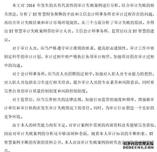现实意义:第一,2017 年十九大报告中提到,要加快完善社会人员市场经济体制。健全金融监管体系,守住不发生系统性金融风险的底线。在目前加强金融监管的主基调之下,对市场信息质量的要求也越来越高,而会计师事务所是为企业财务信息质量提供保障的机构,因此,会计师事务所的作用也会日渐突出。然而,目前我国的会计师事务所行业,依然存在许多不规范情况,从“银广厦”到“绿大地”,从 ST 博元到ST 智慧,会计师事务所一次次的审计失败,也使得人们对会计师事务所是否真的能够对企业的财务信息质量进行保障产生怀疑。如果人们对企业财务信息的信任被消耗殆尽,那么整个金融市场的风险也将大大增加。本文通过对立信审计失败的案例进行研究,分析审计失败的原因,并针对立信会计师事务所审计失败的具体原因提出相应的建议,进而以此帮助会计师事务所提高审计质量,降低审计失败的概率,增强人们对会计师事务所的信任,降低金融领域的系统性风险。本篇文章正式顺应十九大号召的产物,具备很强的现实意义。